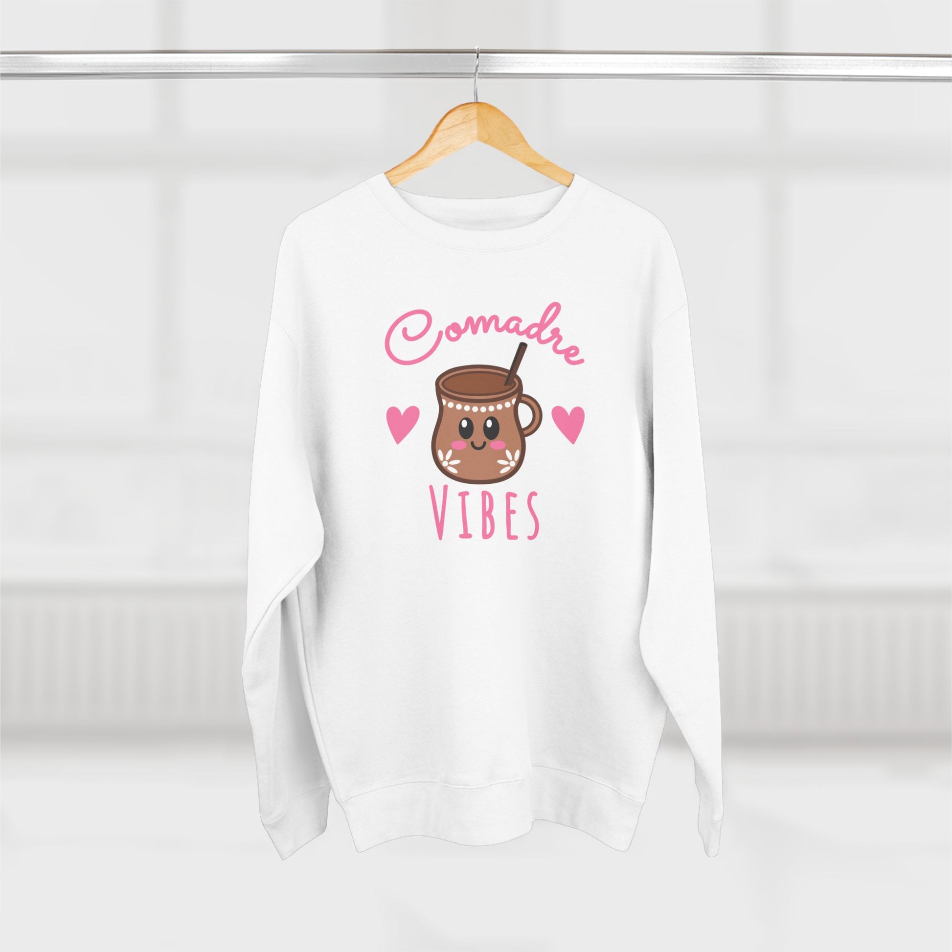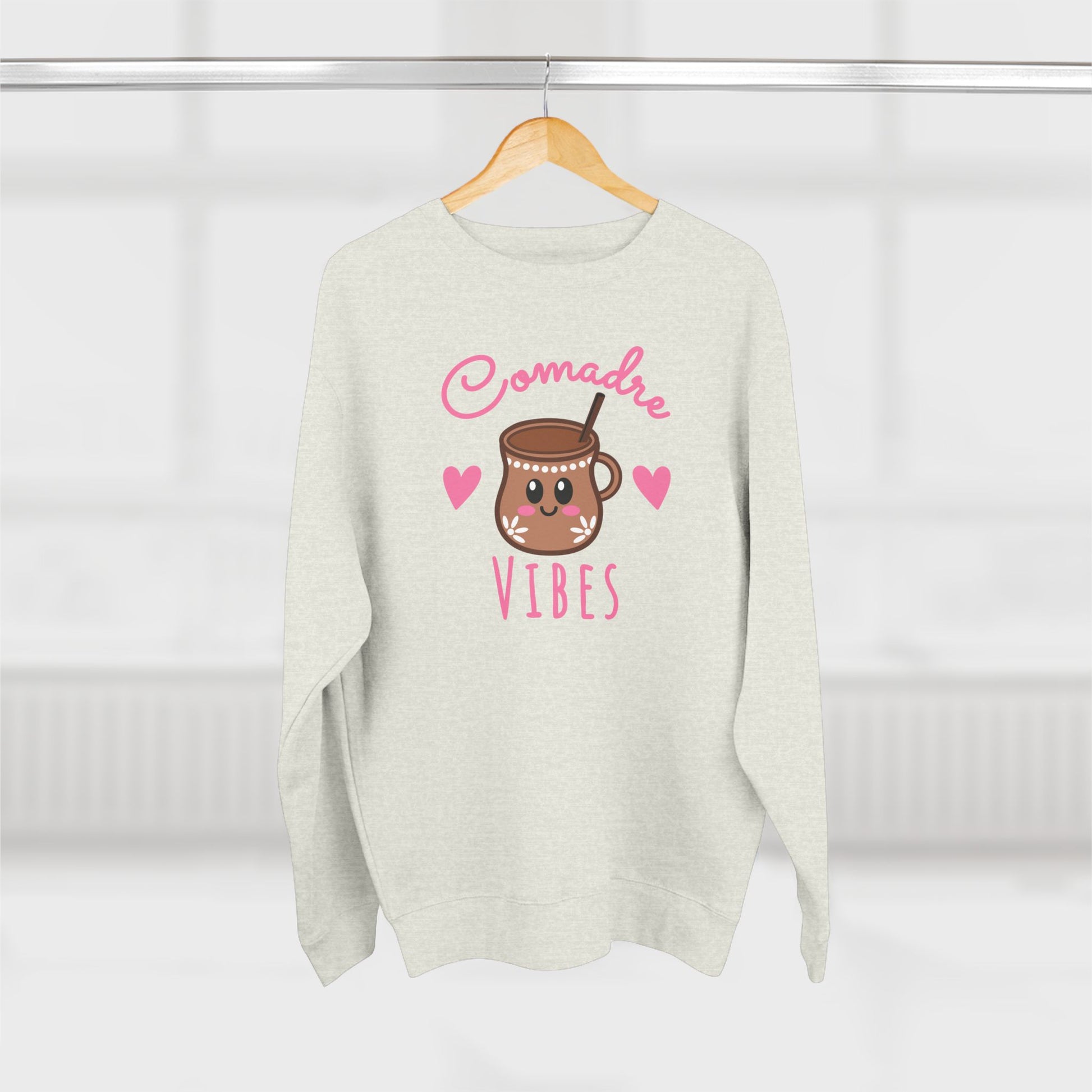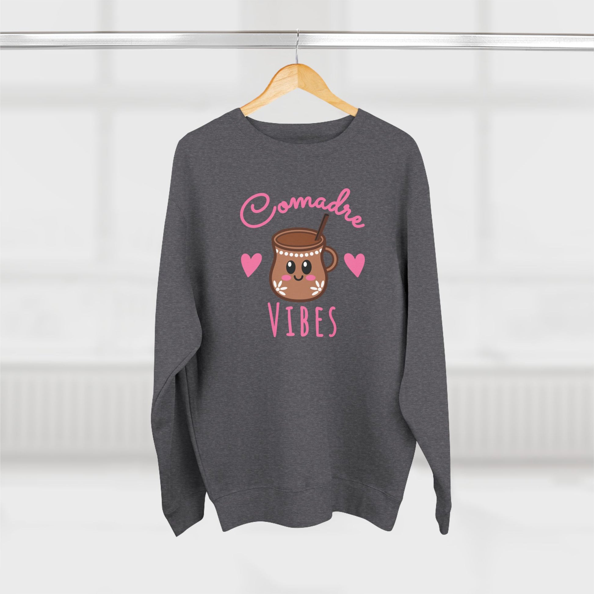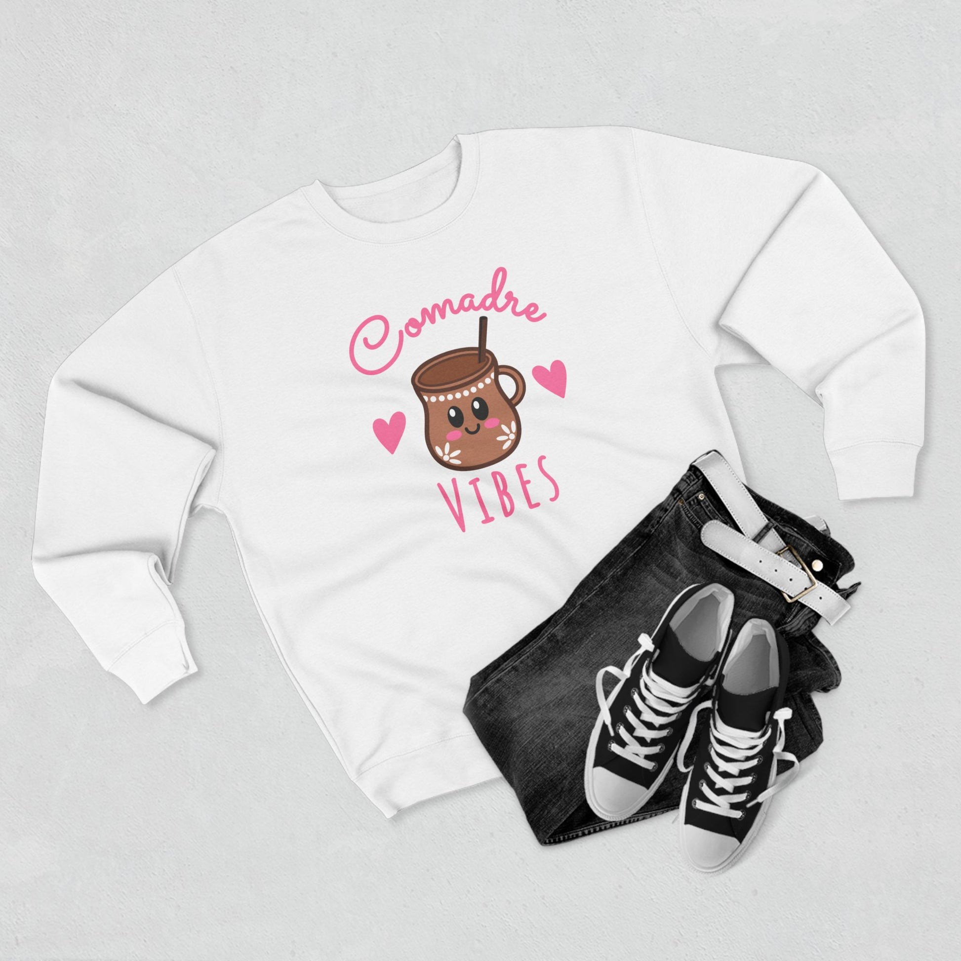 Wrap up in comunidad y cariño with our Comadre Vibes Crewneck, now featuring a cute café de olla clay mug, tiny hearts, and playful lettering. Made for cafecito catch-ups, school drop-offs, and cozy nights with your comadres, this premium crew blends softness, warmth, and everyday style - perfect for celebrating the friendships that last a lifetime.