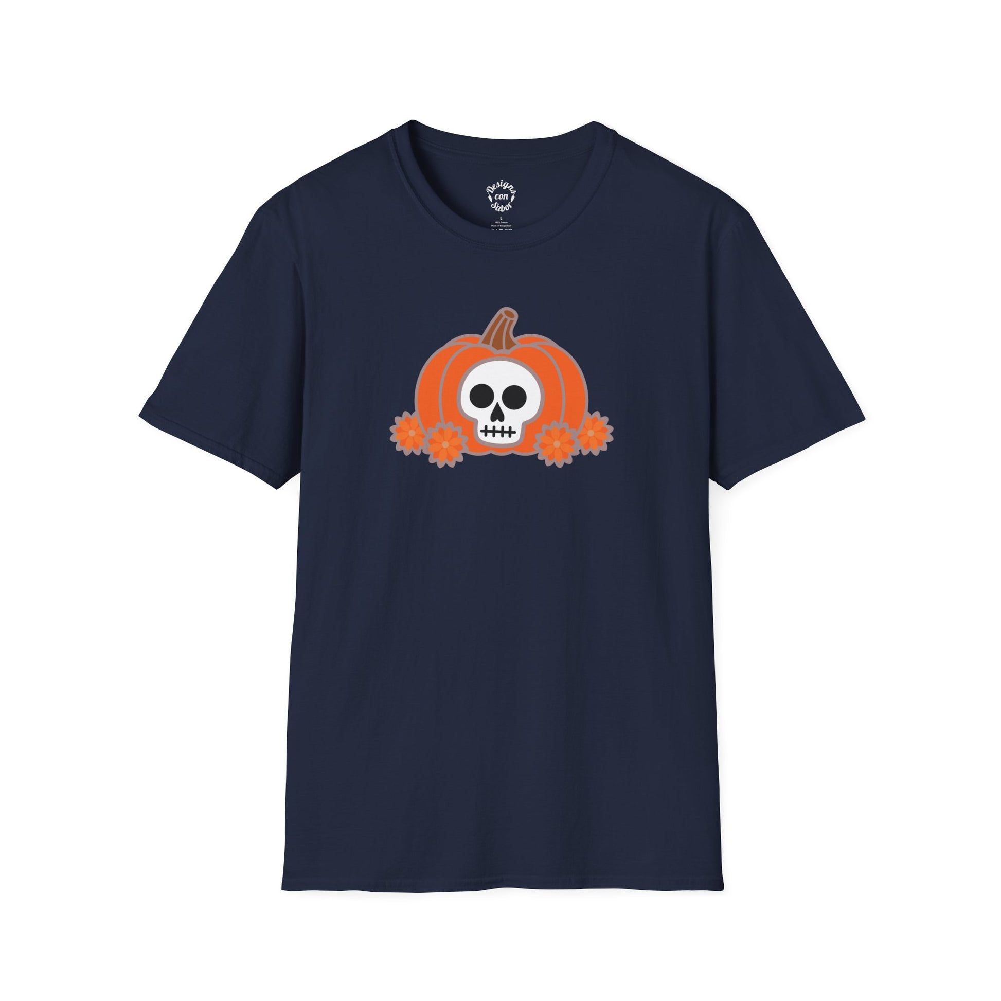 Bring cozy fall vibes - con sabor - to your wardrobe with our Pumpkin Calavera Tee. This playful cartoon design blends Halloween and Dia de los Muertos in a subtle, family-friendly way: a smiling pumpkin, a cute calavera (skull) at the center, and marigolds to honor tradition. It’s simple, adorable, and easy to style for school events, pumpkin patches, ofrenda gatherings, or casual nights out in October and early November.